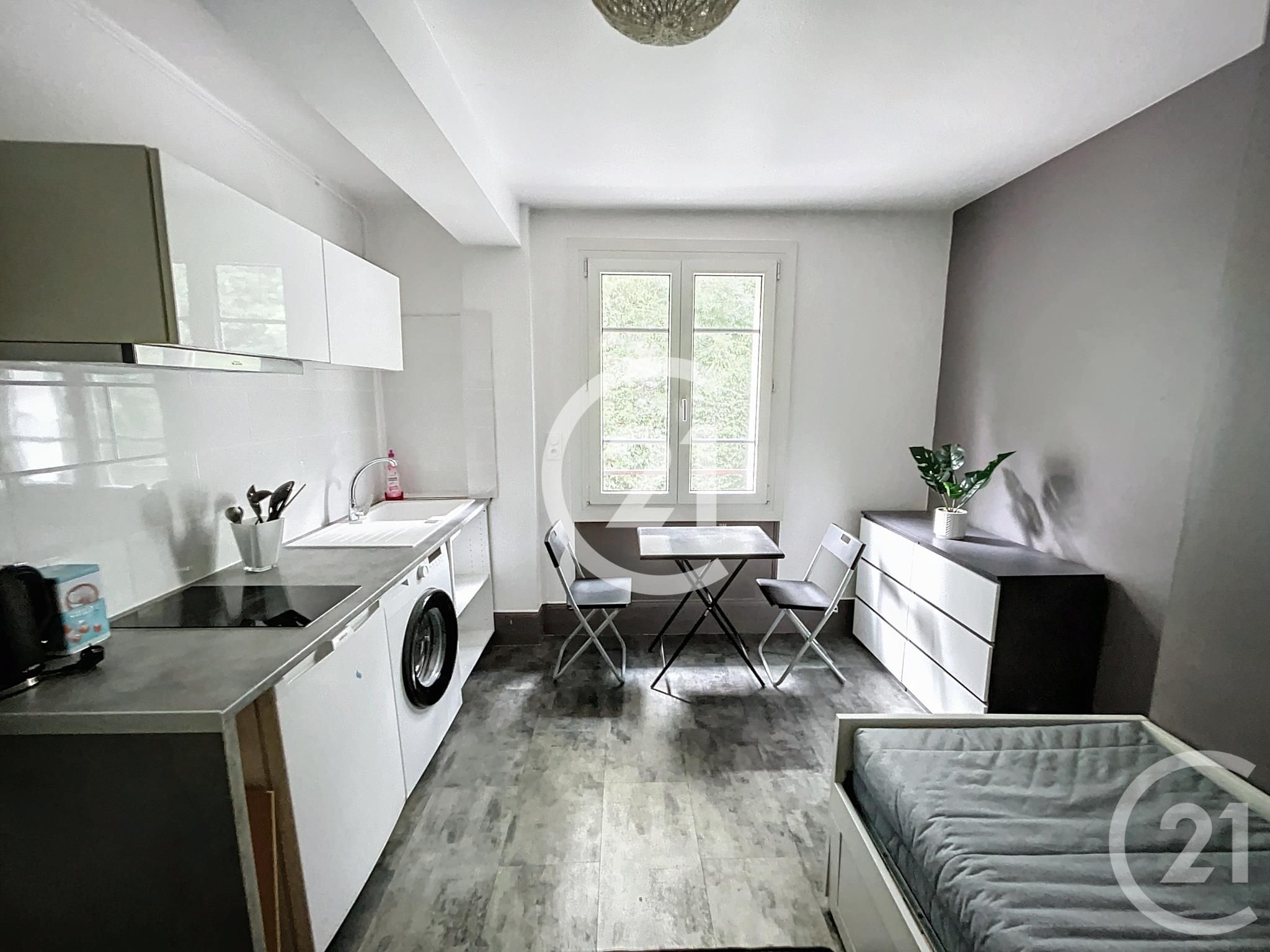 Ce charmant studio meublé est composé d'une entrée, d'une pièce de vie avec son coin kitchenette (plaques, réfrigérateur, machine à laver) et d'une salle d'eau avec WC.